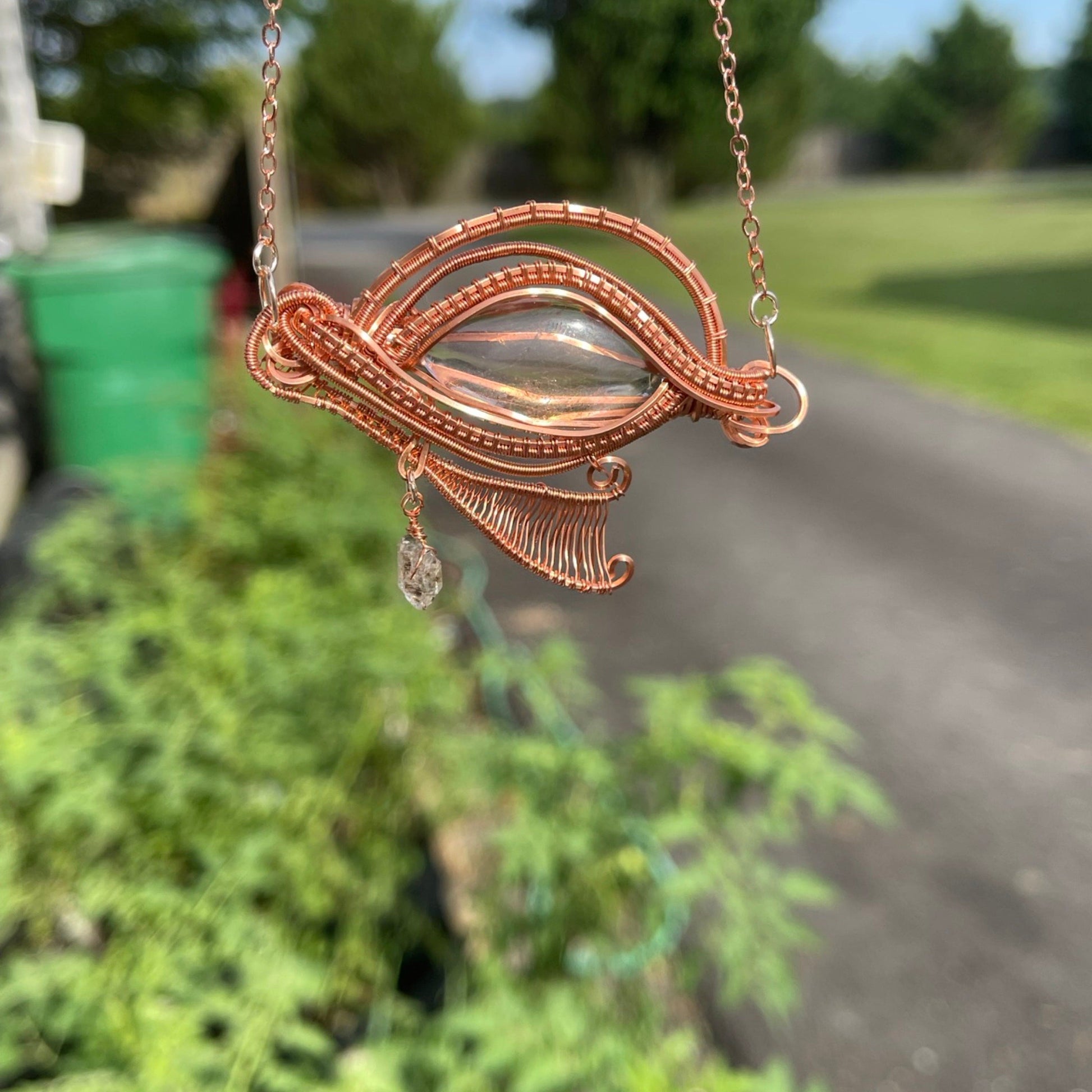 Ametrine and Herkimer Diamonds artfully crafted in tarnish-resistant copper wire, dazzlingly capturing the Eye of Horus. Comes on an 18” chain.