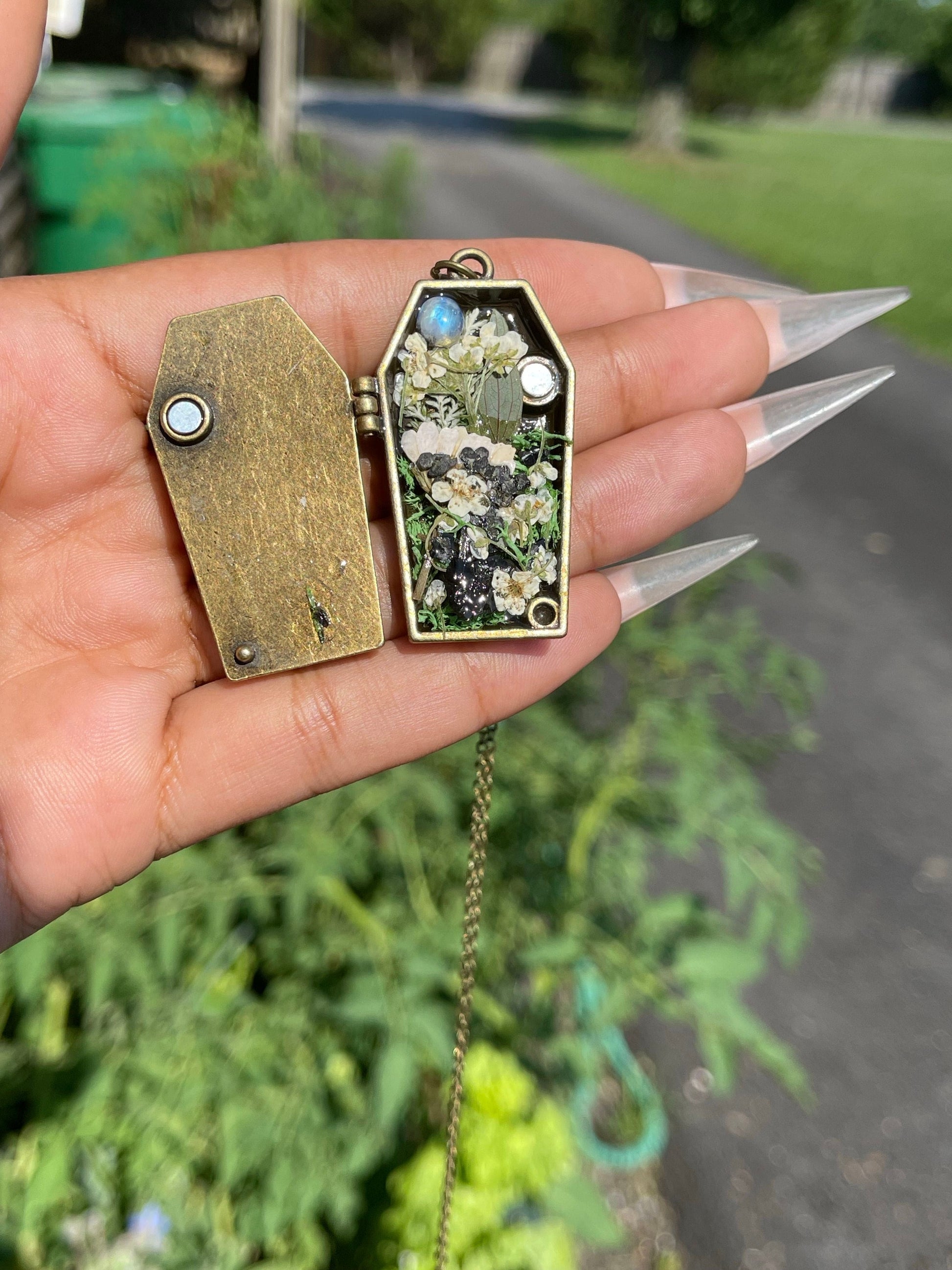 Discover a special, moonstone-studded locket shaped like a coffin, overflowing with delicately-crafted flowers. This statement piece also comes with an 18” chain.