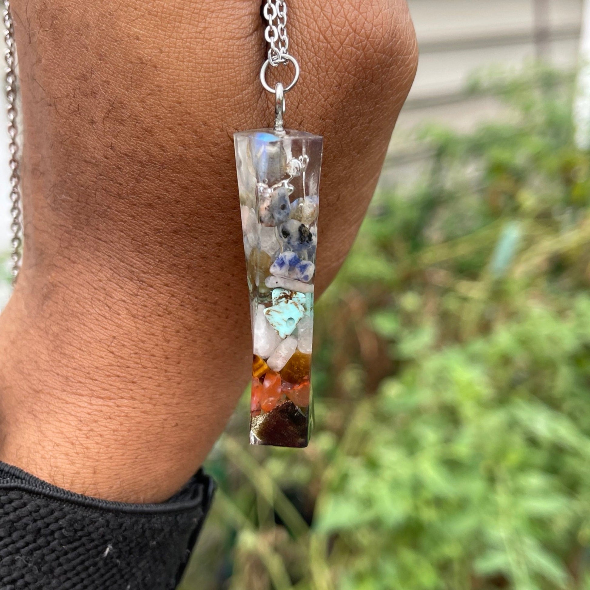 The Seven Chakras pendants are made in house with real crystals and resin.