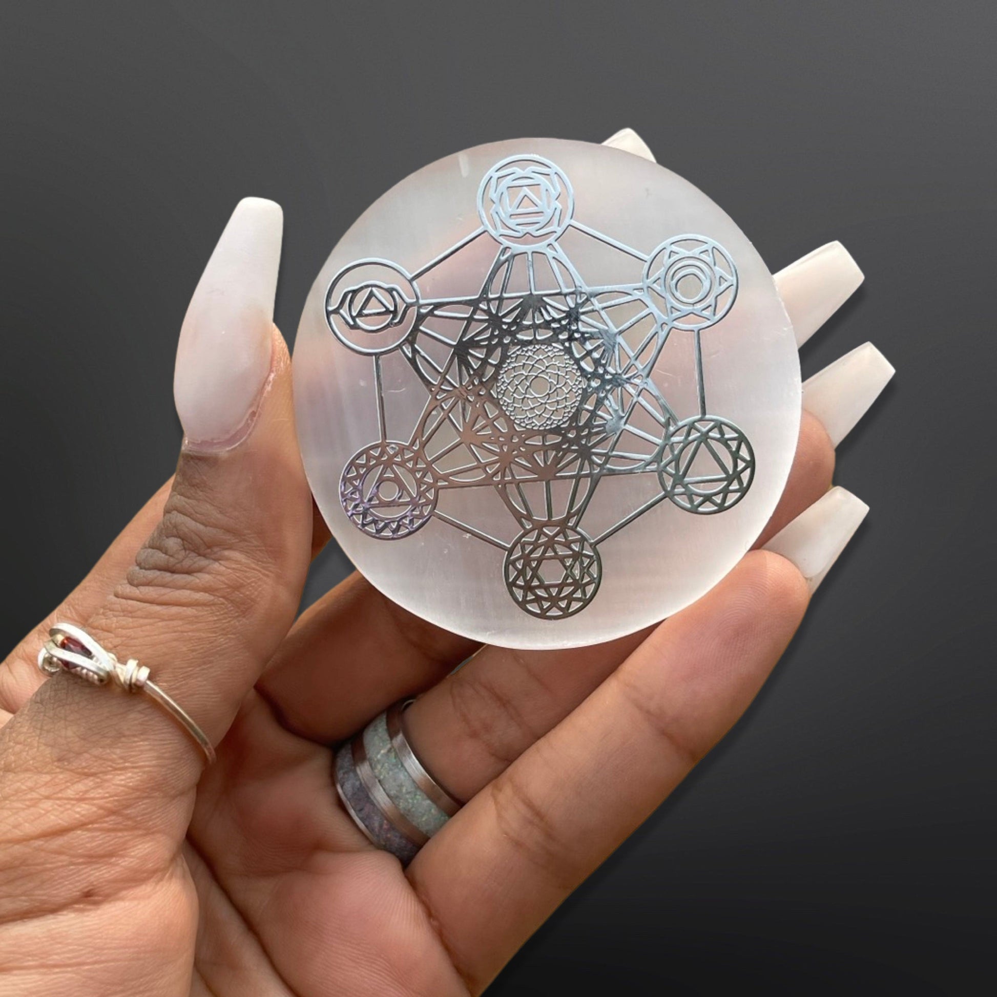 Add an elegant, organic touch to your home decor with the Engraved Selenite Plates. Crafted from laser engraved selenite and decorated with silver and gold decals, these beautiful plates measure 2.4 inches for the perfect decorative accent.
