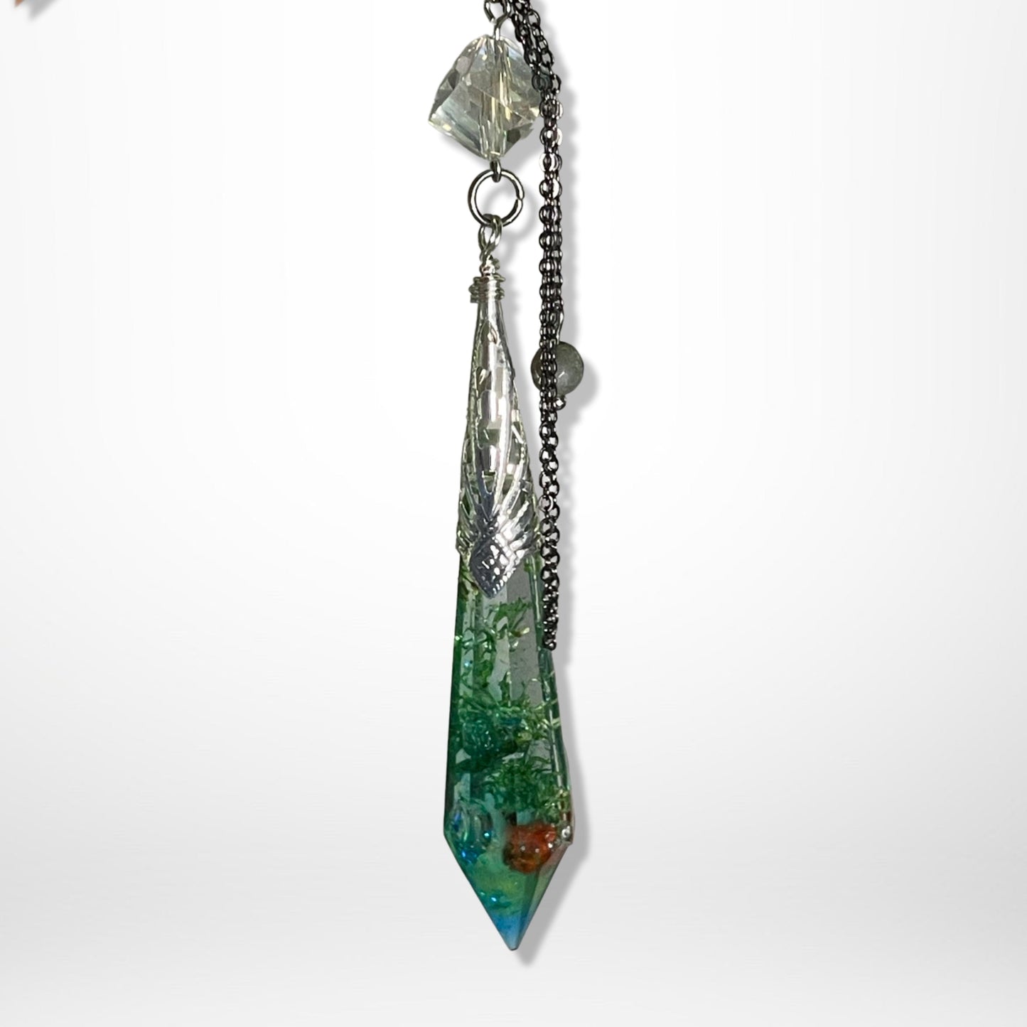 Our Pendulums are meticulously handcrafted with resin, flower petals, intense silver flakes, and shimmers of gold flecks! Of course, it wouldn’t quite be complete without the magical powers of the crystal pendulum. Each piece is adorned with its own unique-looking crystal - so no two pendulums are alike!