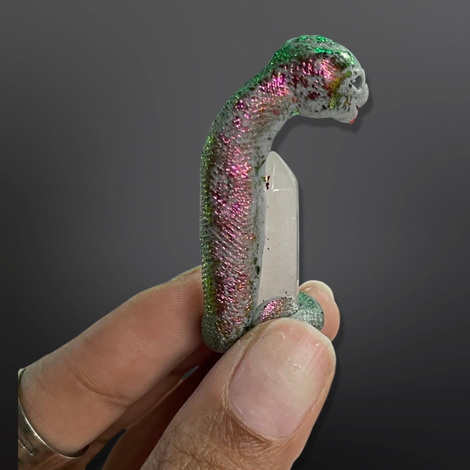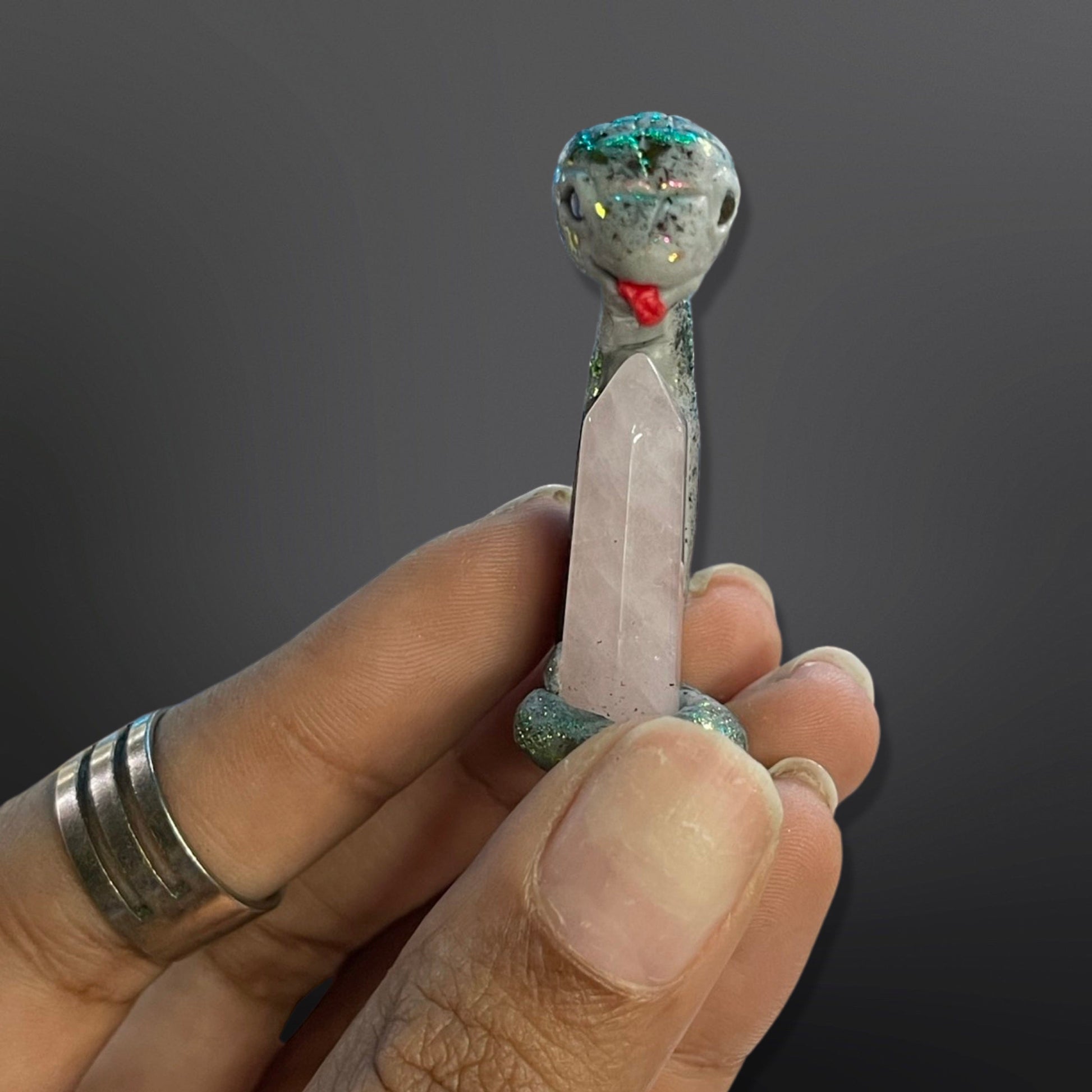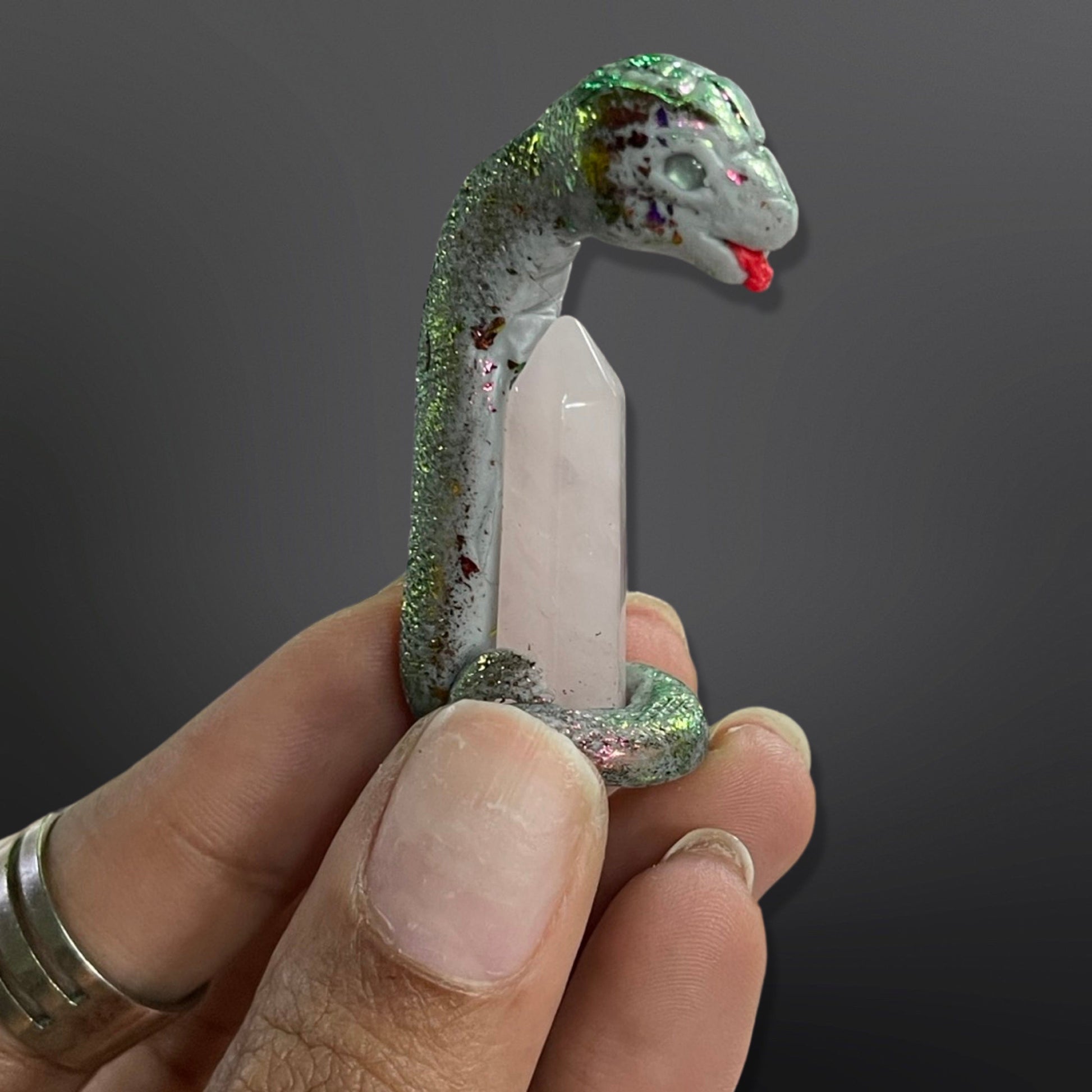 Bring a unique, eye-catching piece of art to your desk with the Guarding Love Snake Desk Friend! Handcrafted out of polymer clay with labradorite eyes, it stands watch over a mini rose quartz tower. Add a playful touch to your workspace that's sure to inspire!