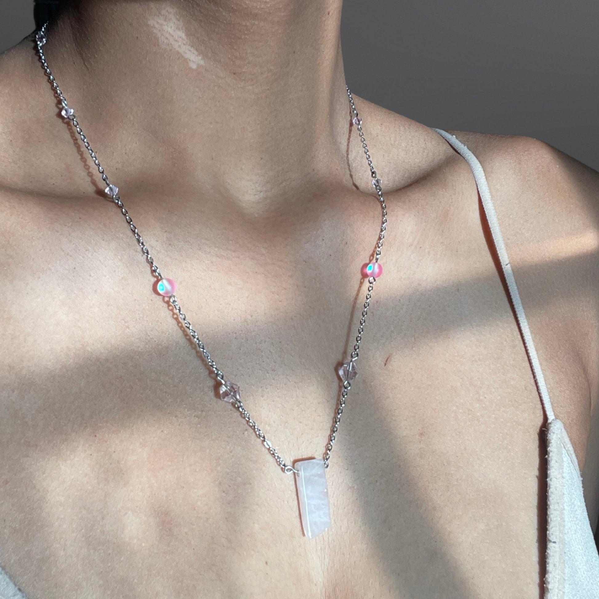 Our beautiful Rose Quartz Satellite Chokers will have you feeling like a modern-day goddess. Crafted with real rose quartz, Preciosa crystals, light pink crystal beads, glass mermaid beads and titanium-plated copper wire, these delicate necklace pieces add style and sophistication to any fashion look. The soft blush tones of the stones and gold base create an uplifting colour palette that is timeless and feminine. This elegant satellite design is light enough for day wear or for ’70s inspired evening glamour, a must-have wardrobe essential for all modern women. Plus, the stainless steel chain makes them strong yet lightweight for comfortable everyday wear - perfect for holding your look together through long days out or special occasions. Get ready to shine with our Rose Quartz Satellite Choker!