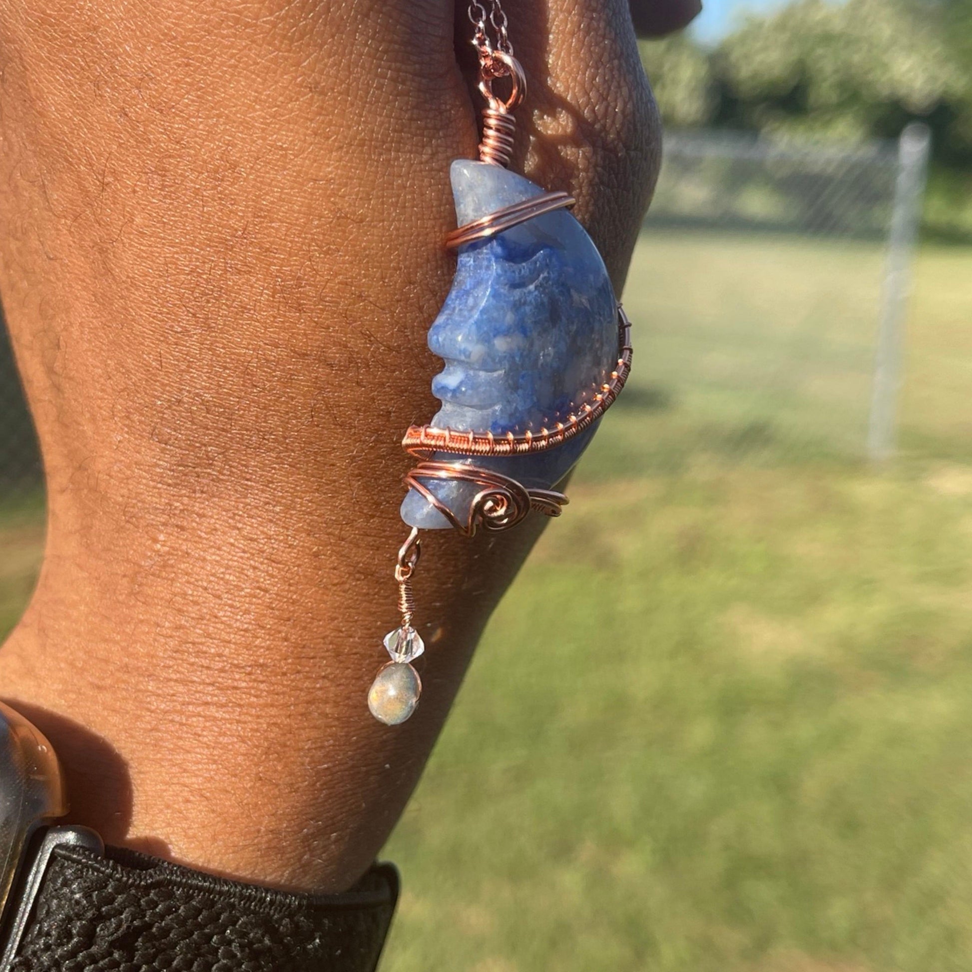 A one-of-a-kind piece for the whimsically inclined - this beautiful moon face pendant is crafted with blue aventurine and finished with an eye-catching labradorite. Tarnish-resistant copper wire and a sparkling 18" rose gold plated chain complete the look. Can you feel the magical energy emanating from it?