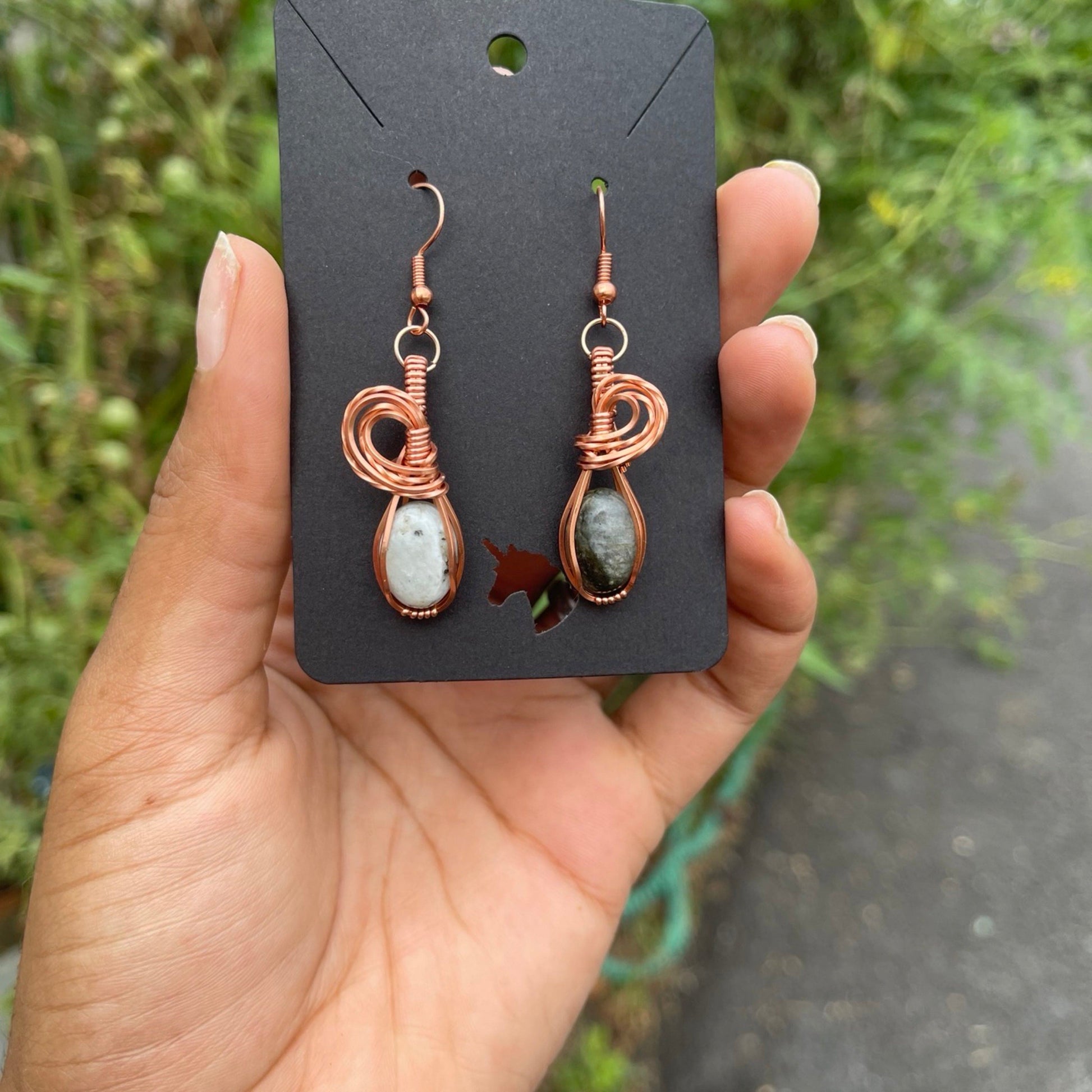 Dazzle onlookers with these unique Copper Labradorite Earrings. Every piece is crafted with luxurious labradorite stones, finished with a tarnish resistant copper wire and 14k rose gold plated French earring hooks. Feel confident that these earrings will make a statement and bring you compliments. Look and feel your best––get your Copper Labradorite Earrings today!